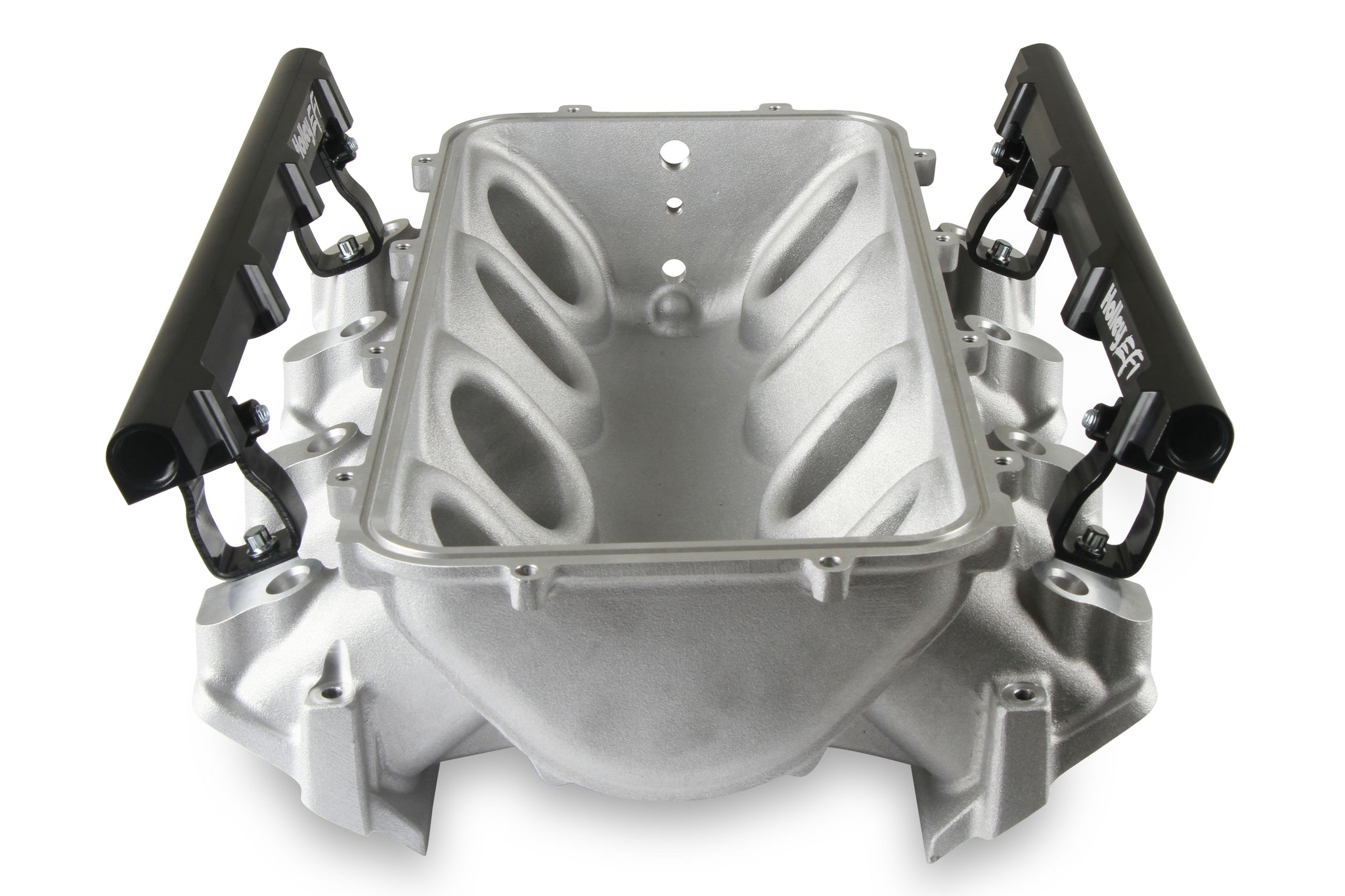The Holley LS3 Lo-Ram intake manifold kits are designed for GM LS Gen III and IV engines equipped with GM LS3/L92 cylinder heads. These intake manifolds will work with OE or aftermarket cylinder heads. The Lo-Ram intake manifolds are designed for forced induction (supercharged or turbocharged) engine applications and the 105 mm throttle body part number 112-581 or similar models. The base intake manifold is designed with a low height to aid the packaging of a plenum-mounted air-to-water intercooler in a top-feed configuration. Additional manifold designs include both single and dual injector options. Available with both as-cast satin and black power-coat finishes. High volume fuel rails for eight and sixteen injector configurations. Mounting hardware included with 3/4-16 O-ring ports (8 AN)
