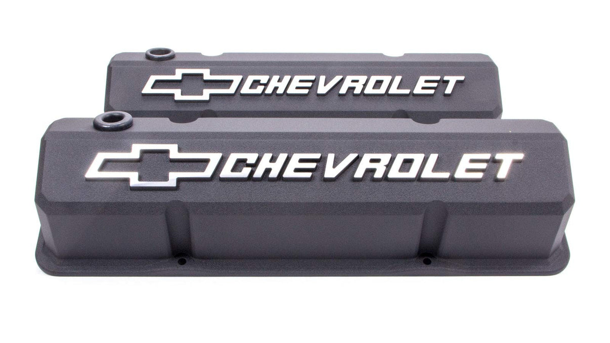 | Description_EXT | Engine Valve Cover; Slant-Edge Style With Baffles; Black Crinkle Finish With Raised Chevy and Bowtie Logos; Fits 1955 to 1986 262-400 Small Block Chevy Engines; Made From Die Cast Aluminum; Officially Licensed GM Product; Sold As Pair |