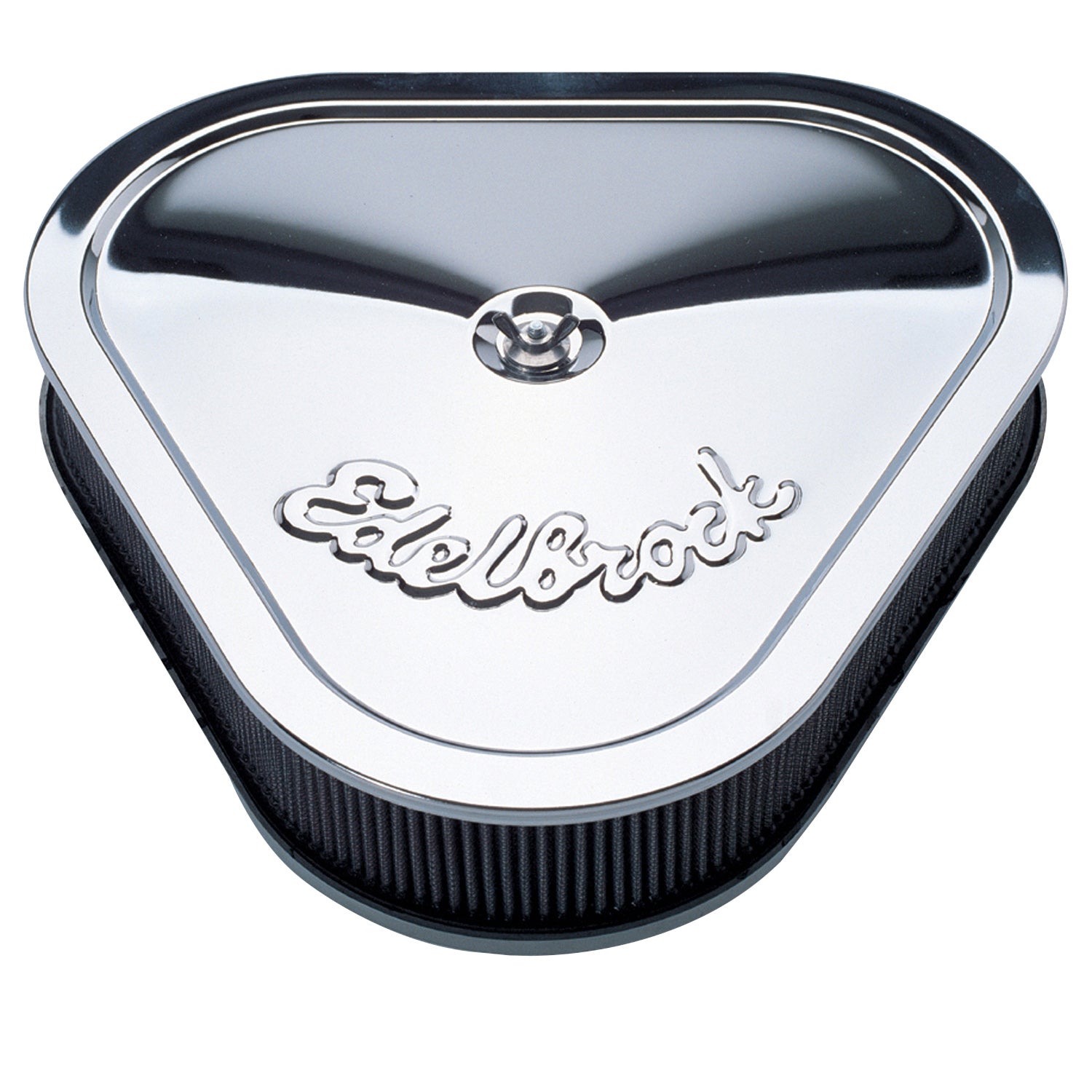 Description_MKT | The Signature Series triangular air cleaner #1222 is a new style with a shape reminiscent of the muscle car era. This hot looking chrome air cleaner has the classic Edelbrock signature. This triangular air cleaner comes with high-quality 2-1/2" washable, pre-oiled cotton gauze filter for excellent filtration. Designed for use with 5-1/8" diameter carbs (Edelbrock square-bore, Q-Jet, etc.), the Pro-Flo #1222 clears HEI distributors and electric choke housings. Air cleaner dimensions: 14-1/8" wide x 13-3/8" long |