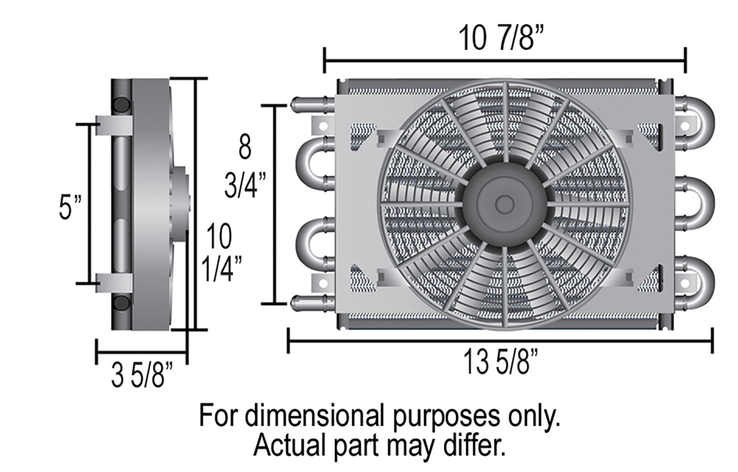 Description_MKT | The Dyno-Cool Universal Remote Cooler can be mounted anywhere space permits, using a highly efficient copper tube/aluminum fin cooler and a curved blade fan to provide airflow and extend transmission life. Perfect for medium duty use. Mounting kit not included. |